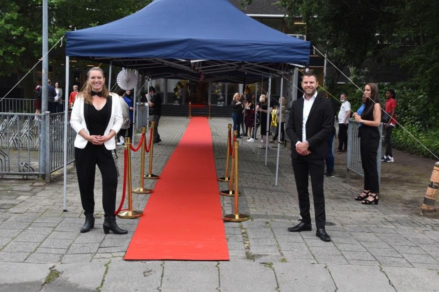 Er was een limousine die de leerlingen steeds per groepje voor de deur van de school ‘afleverde’ en eenmaal uitgestapt lag de rode loper klaar, plus een erehaag van alle eigen docenten. Applaus steeg daaruit op toen de leerlingen als ware sterren passeerden.